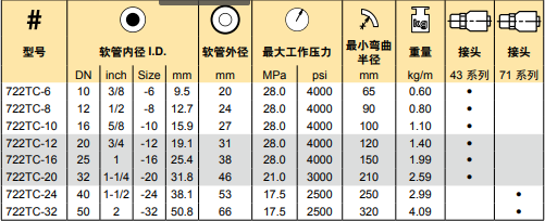 722TC是高性能軟管。彈性四層鋼絲纏繞結(jié)構(gòu)和派克的TC耐磨外膠層提供了無與倫比的應(yīng)用方式。722TC軟管的性能符合SAE 100R12標(biāo)準(zhǔn),而彎曲半徑只有SAE 100R12標(biāo)準(zhǔn)軟管的一半,便于安裝及使用。另外,其合成橡膠的內(nèi)膠層具有良好的介質(zhì)兼容性。