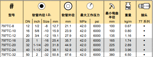 適用介質:石油基液壓油,水 乙二醇,潤滑油,柴油,空氣 和水。用于1.7MPa以上的空氣 時,軟管需針刺。